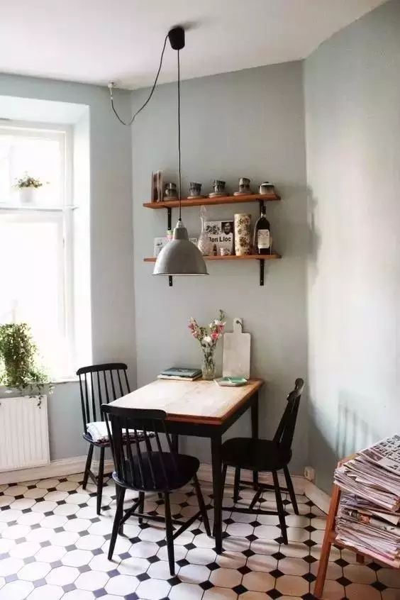 2.利用拐角布置就餐區(qū),靠墻設(shè)置一個(gè)實(shí)用的餐邊架,可以將餐具等物品放置在上面,既美觀又方便取用而且還減少了廚房的收納壓力。
